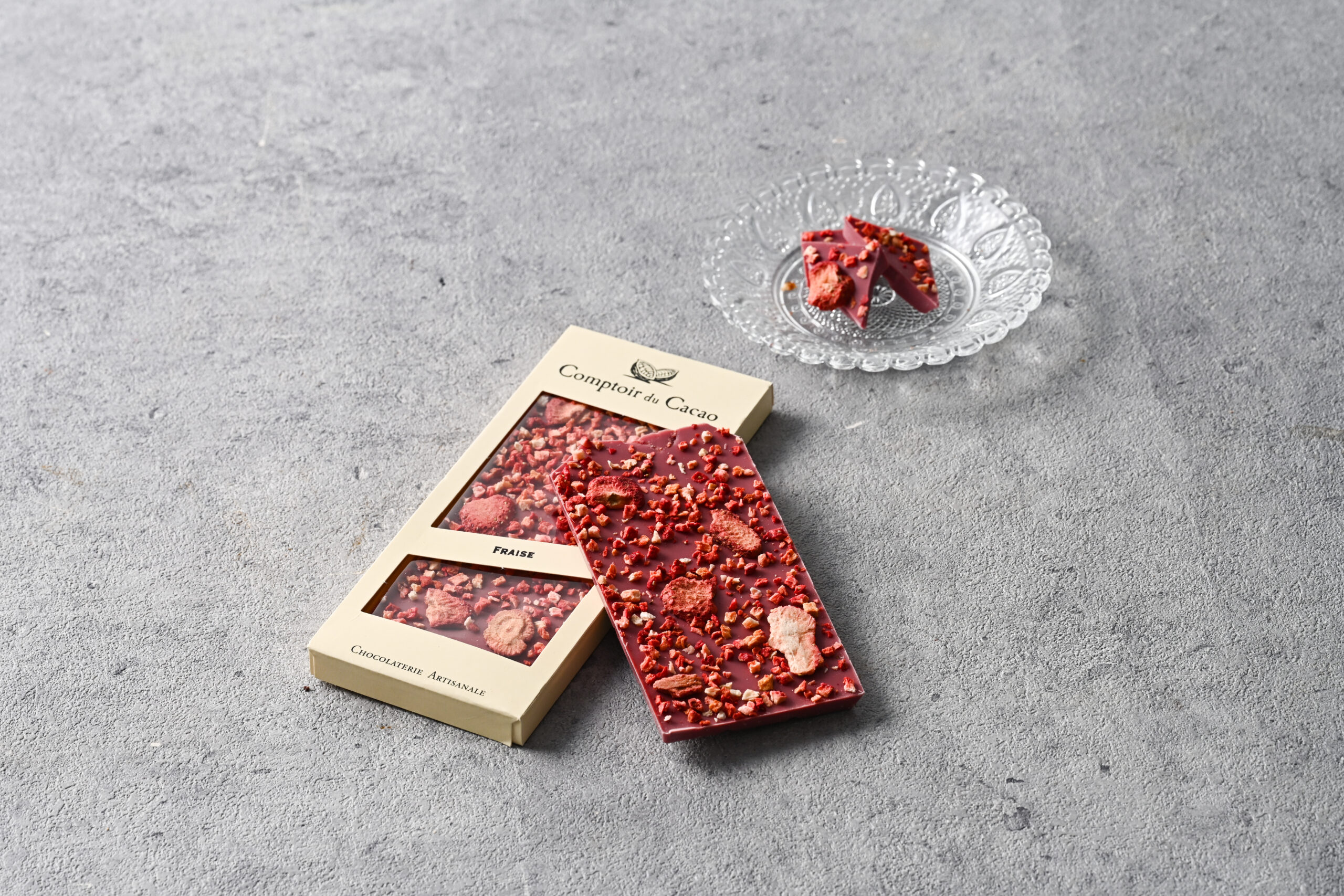 話題のルビーカカオから作られる着色料不使用ながらもルビー色が美しい、ルビーチョコレートにサクサクドライストロベリースライスを並べた抜群にかわいいチョコレートです。繊細なルビーカカオの風味にさわやかないちごの酸味がさえわたる、間違いなしのコンビネーションはやみつきのおいしさです。